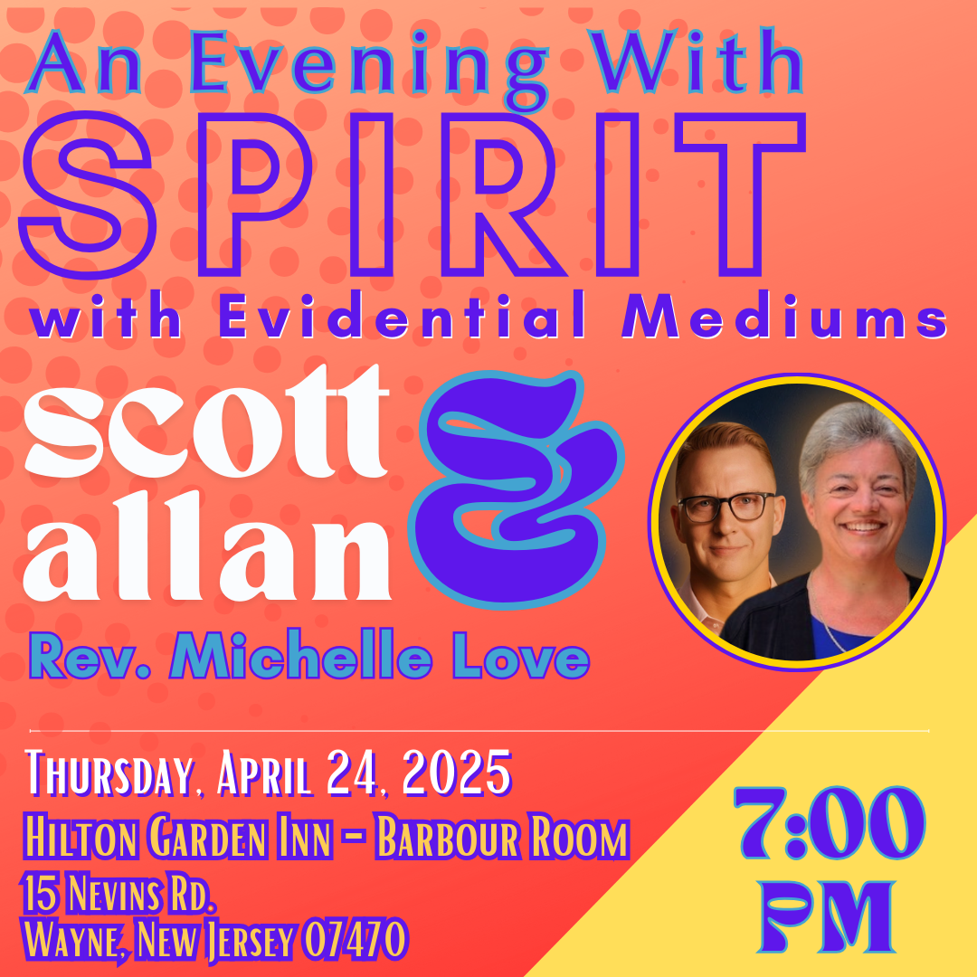 Join evidential mediums Scott Allan and Michelle Love for a powerful night of spirit connections at the Hilton Garden Inn, 15 Nevins Rd., Wayne, NJ, on Thursday, April 24, 2025, at 7:00 PM (Doors open at 6:15 PM).